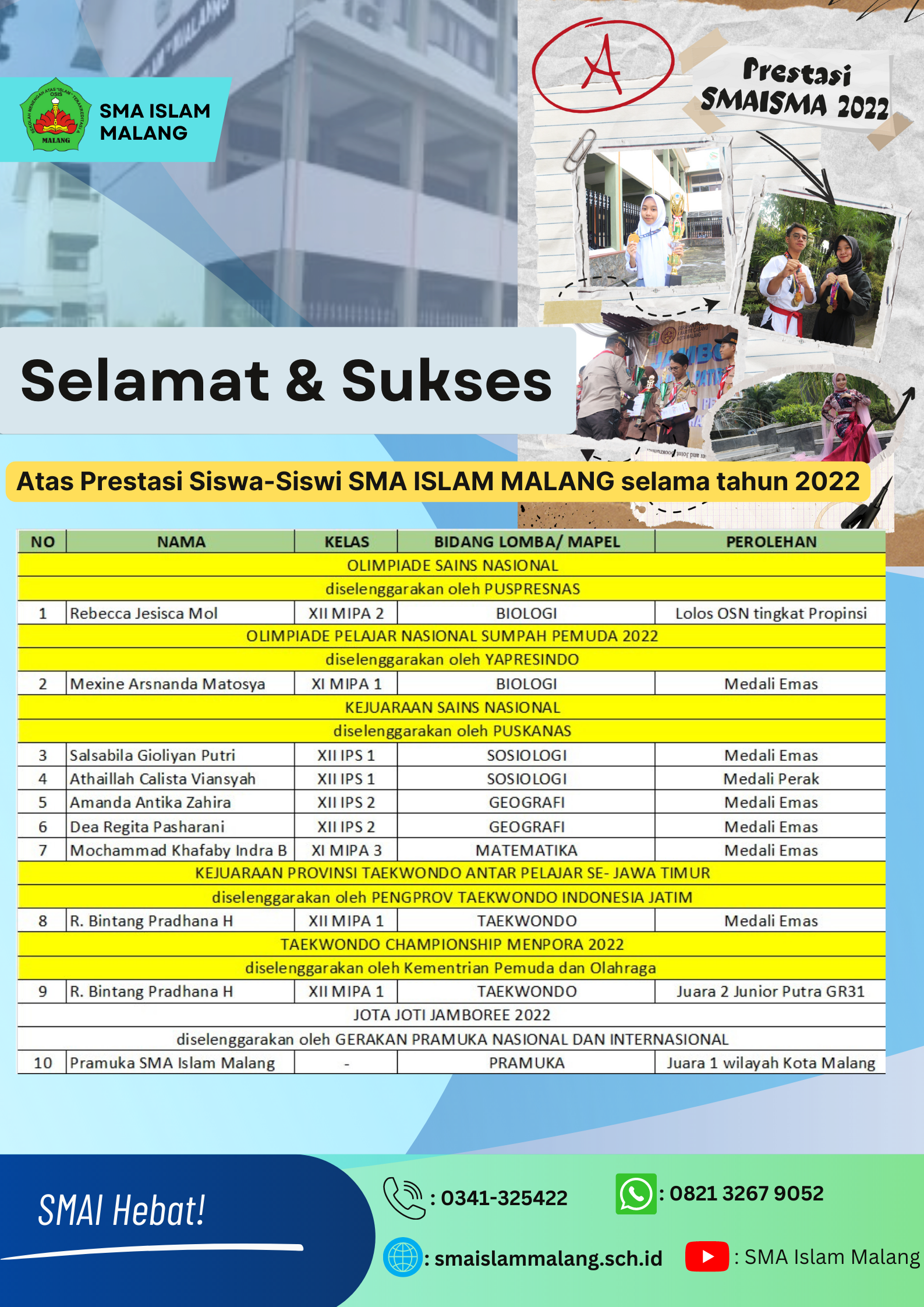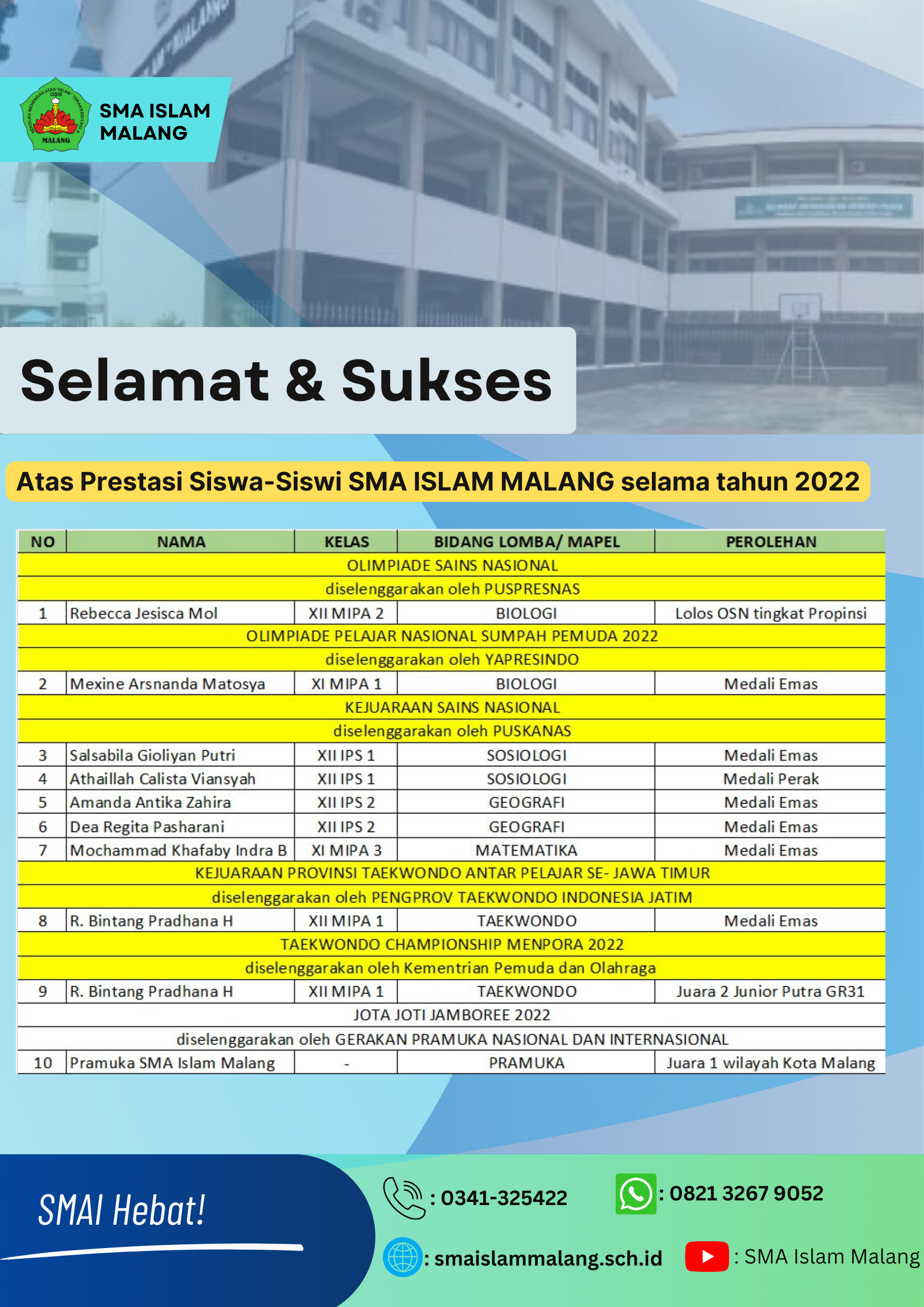 Selama tahun 2022, siswa siswa SMA Islam Malang telah meraih prestasi baik di bidang akademik maupun non-akademik. Semangat yang luar biasa telah meraka tunjukkan. Semoga semangat untuk meraih prestasi di tahun ini bisa ditingkatkan di tahun 2023 nanti. Terimakasih siswa siswi SMA Islam Malang yang telah membanggakan nama sekolah. Sampai jumpa di tahun 2023 dengan dengan raihan prestasi yang lebih luar biasa. SMAISMA Hebat!
